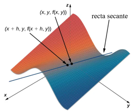 $$ \frac{f(x + h, y) \,- f(x, y)}{h}. $$Esta recta es paralela al plano $xz$. Por lo tanto, la pendiente de la recta secante representa una tasa de cambio promedio de la función $f$ a medida que nos desplazamos paralelamente al eje $x$. A medida que $h$ se aproxima a cero, la pendiente de la recta secante se aproxima a la pendiente de la recta tangente.
