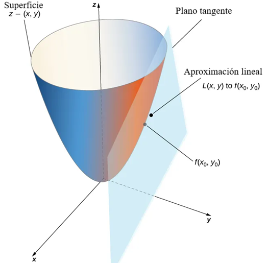 Dada una función $z = f(x, y)$ con derivadas parciales continuas que existen en el punto $(x_0, y_0)$, la aproximación lineal de $f$ en el punto $(x_0, y_0)$ viene dada por la ecuación