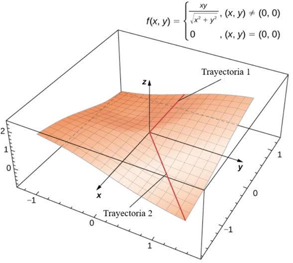 Dependiendo de la trayectoria tomada hacia el origen, este límite toma diferentes valores. Por lo tanto, el límite no existe y la función $f$ no es diferenciable en el origen, como se muestra en la siguiente figura.