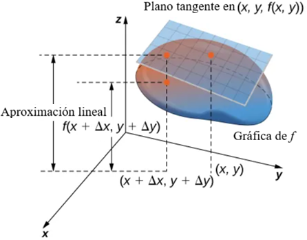 $$ \begin{aligned} f(x + \Delta x, y + \Delta y) &= f(x, y) + \Delta z \\ &\approx f(x, y) + f_x(x_0, y_0) \, \Delta x + f_y(x_0, y_0) \, \Delta y. \end{aligned} $$Consulte la siguiente figura.