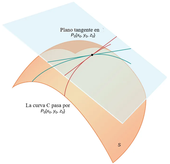 Sea $P_0 = (x_0, y_0, z_0)$ un punto en una superficie $S$, y sea $C$ cualquier curva que pase por $P_0$ y se encuentre enteramente en $S$. Si las líneas tangentes a todas estas curvas $C$ en $P_0$ se encuentran en el mismo plano, entonces este plano se llama el plano tangente a $S$ en $P_0$ (Figura 11.4.1).