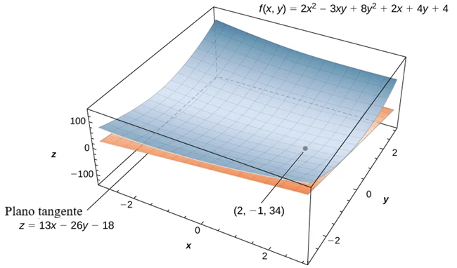 $$ \begin{aligned} f_x (x, y) &= 4x – 3y + 2 \\ f_y (x, y) &= -3x + 16y – 4 \\ f(2, -1) &= 2(2)^2 – 3(2)(-1) + 8(-1)^2 + 2(2) – 4(-1) + 4 = 34 \\ f_x (2, -1) &= 4(2) – 3(-1) + 2 = 13 \\ f_y (2, -1) &= -3(2) + 16(-1) – 4 = -26 \end{aligned} $$Entonces, la Ecuación 11.4.1 se convierte en