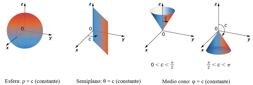 La siguiente figura muestra algunas regiones sólidas que son convenientes de expresar en coordenadas esféricas.
