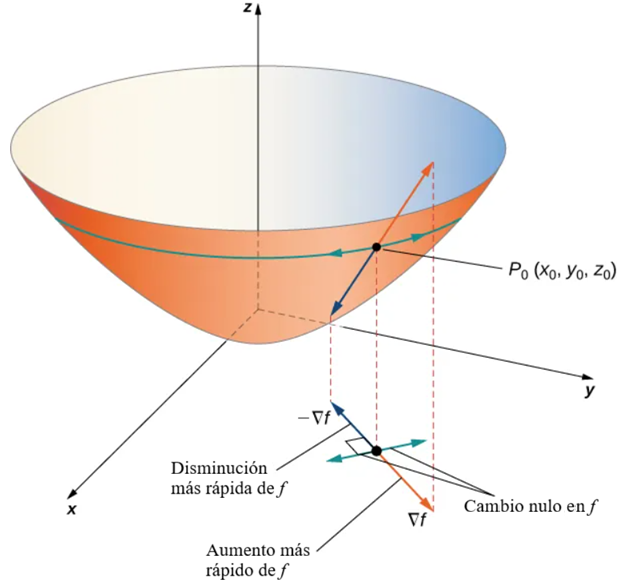 - Si $\nabla f(x_0, y_0) \neq \mathbf{0}$, entonces $D_{\mathbf{u}} f(x_0, y_0)$ se maximiza cuando $\mathbf{u}$ apunta en la misma dirección que $\nabla f(x_0, y_0)$. El valor máximo de $D_{\mathbf{u}} f(x_0, y_0)$ es $\|\nabla f(x_0, y_0)\|$.