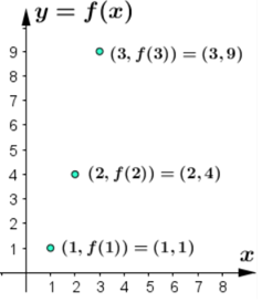 Figura 1.1_3 En este caso, la gráfica de una función f tiene un dominio de {1, 2, 3} y un rango de {1, 4, 9}. La variable independiente es x y la variable dependiente es y.
